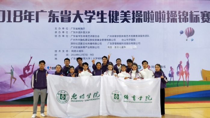 本网讯 12月7-9日,2018年广东省大学生健美操、啦啦操锦标赛在广东外语外贸大学(大学城校区)体育馆举行。我校啦啦操队在教练李强老师的带领下,获得乙组大集体自选技巧啦啦操第一名、自选花球舞蹈啦啦操第一名的好成绩!健美操队在教练史辰雁老师的带领下获得乙组街舞自选套路大集体第一名和轻器械健身操自选动作第四名。我校参赛师生合影此次比赛由广东省教育厅主办,共有来自全省55所高校的1554名运动员参加了比赛。供稿:体育学院审稿:马锦雄 陈雄辉 审核:金伟