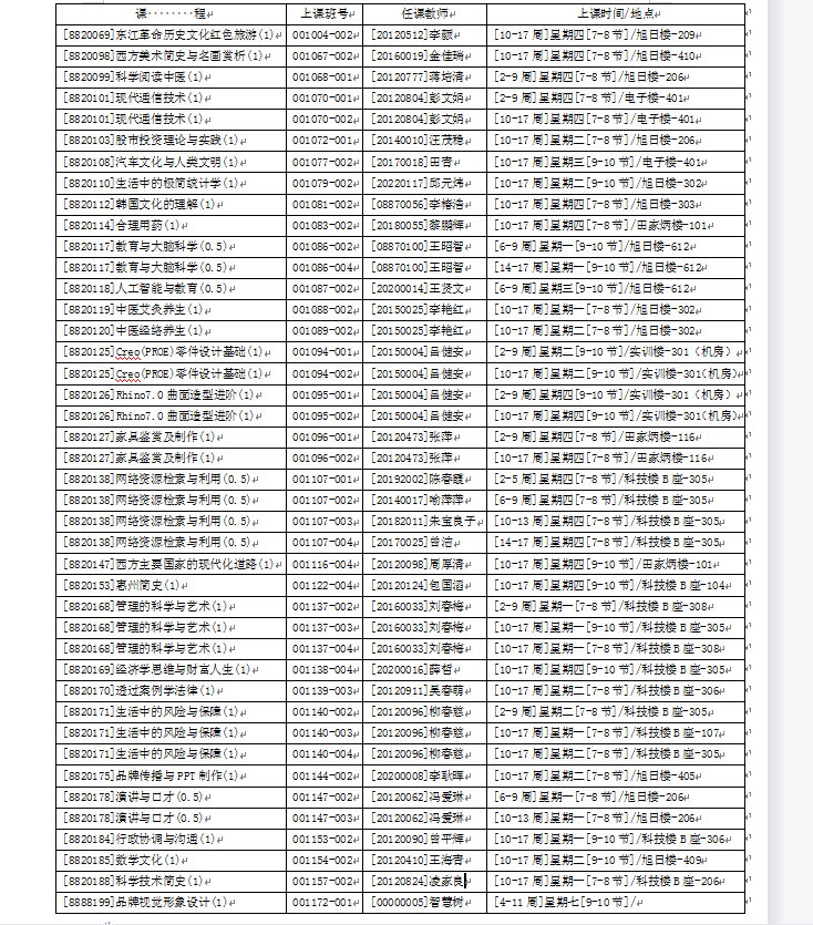 下列公共任选(通识)课学生人数不足停开,因停开课需补退选的同学可在规定时间段退选再选修其他课程,退选时间为:9月5日(星期一)00:00-9月8日(星期四)23:59,补选时间为9月9日(星期五)12:00-23:59,请通知相关任课老师和学生。
