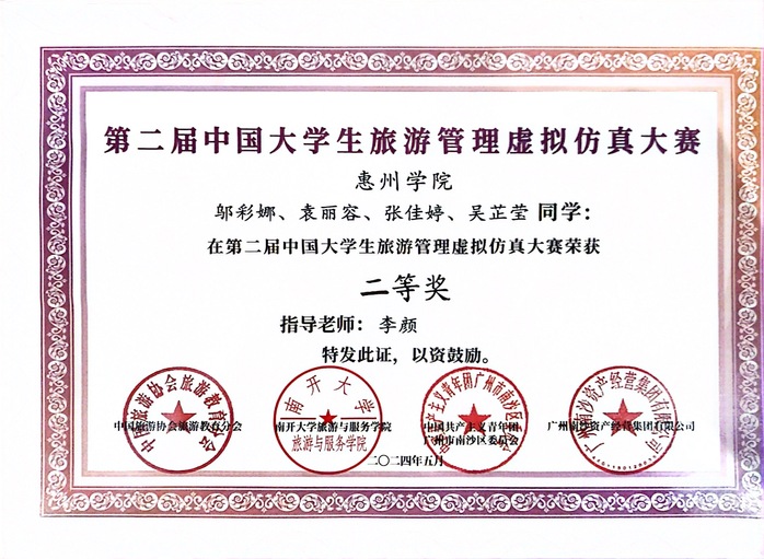 本网讯 5月15日至19日,由中国旅游协会旅游教育分会、南开大学旅游与服务学院、共青团广州南沙区委员会等单位主办的第二届中国大学生旅游管理虚拟仿真大赛决赛,在广州南沙区落下帷幕。我校地理与旅游学院学生邬彩娜、袁丽容、张佳婷、吴芷莹四位同学组成的团队,在地理与旅游学院旅游管理系李颜教授的指导下,在全国224个决赛参赛队中脱颖而出,获得决赛二等奖。